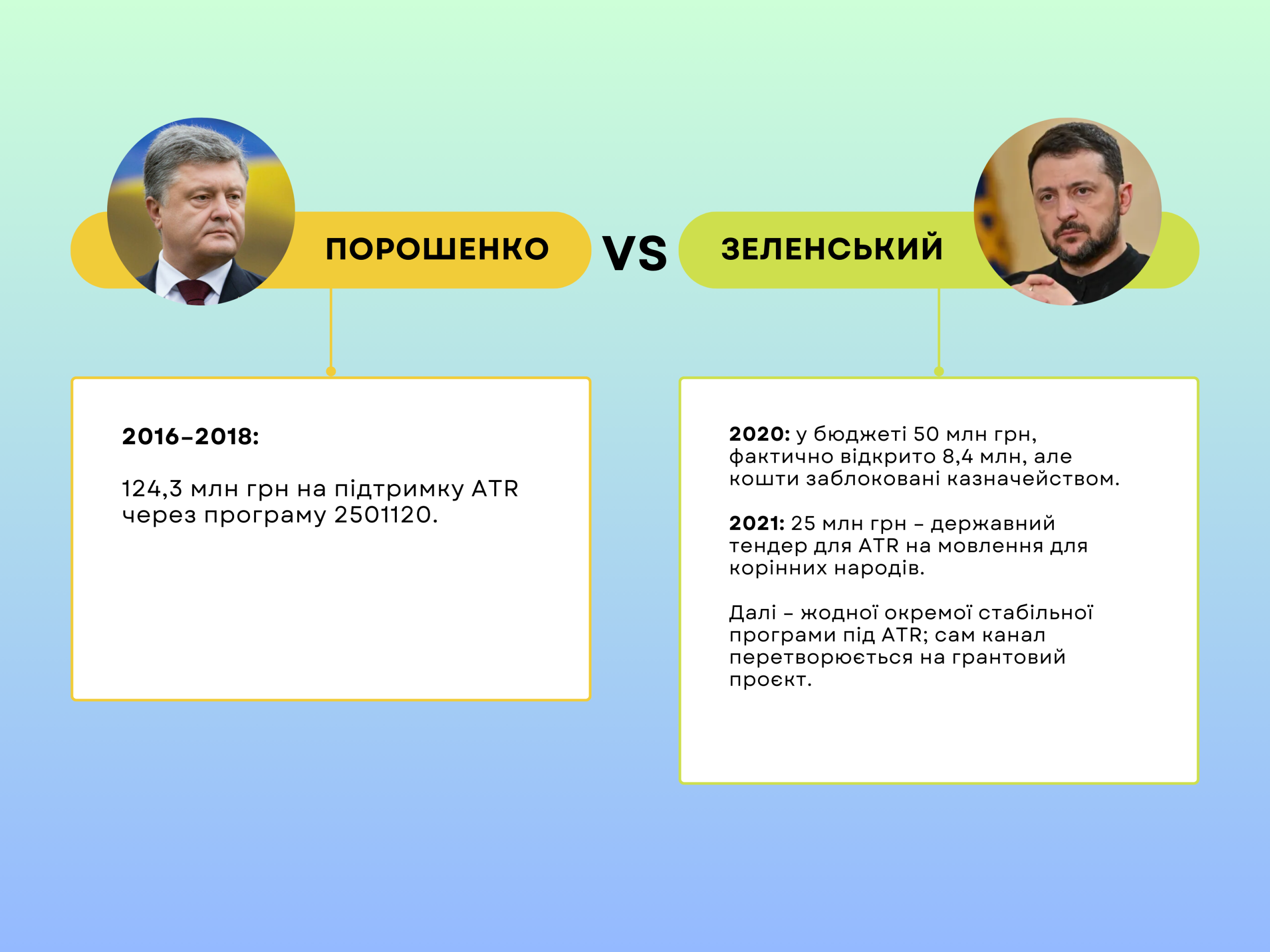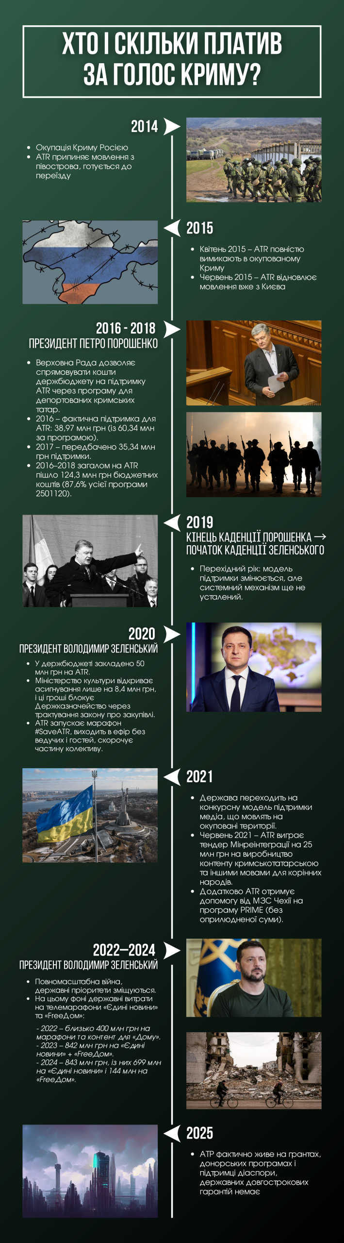 Паралельно уряд закриває кримськотатарські блоки UATV, та відкриває канал FREEДОМ — повністю російськомовний державний інформаційний продукт. Після кількох років «завислих» платежів у 2021-му уряд нарешті розблоковує фінансування. ATR отримує частину боргу й контракт приблизно на 25 мільйонів гривень на кримськотатарський контент. Цього вистачає, щоб вийти з критичної фази й не гасити світло в студіях.