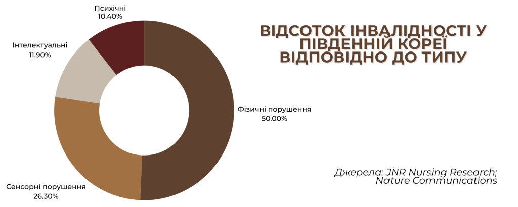 Станом на 2023 рік у Південній Кореї проживало понад 2,64 мільйона людей з інвалідністю. Це приблизно 5,1% від усього населення. Половина з них — люди віком від 65 років і старші. Найпоширеніші типи інвалідності — фізичні порушення (понад 50%). Далі йдуть сенсорні порушення (порушення зору та слуху) — близько 26,3%, інтелектуальні — 11,9% та психічні — 10,4%.