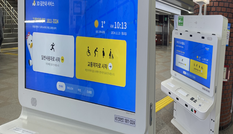 Інтелектуальні кіоски — це пристрої, якими можуть зручно користуватись люди з різними типами інвалідності.Чотири таких кіоски вже встановили в Національному музеї Кореї (Сеул). У Пусані їх поставили ще у 2021 році на станціях метро, щоб допомогти людям з обмеженою мобільністю.